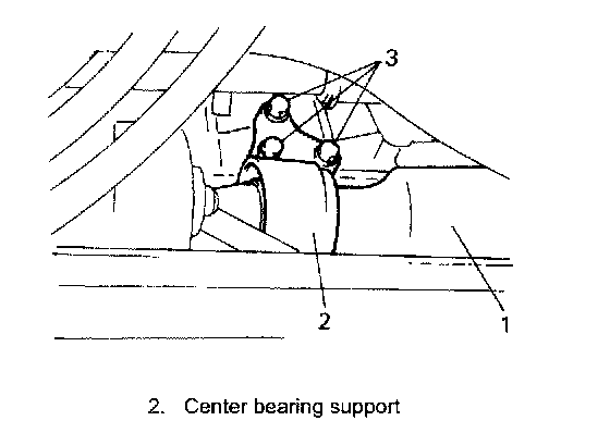 7. Remove center bearing support bolts (3) and pull out center drive shaft (1) from differential gear. (for RH drive shaft).