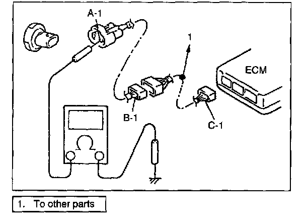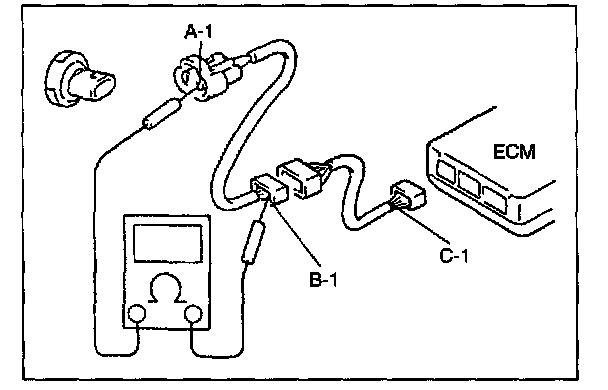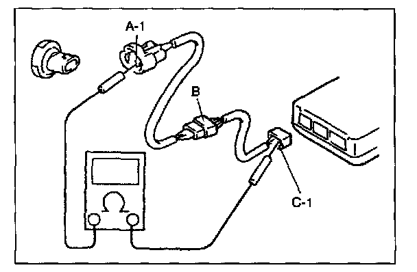 If no continuity is indicated, that means that the circuit is open between terminals "A-1," and "B-1". If continuity is indicated, there is an open circuit between terminals "B-1" and "C-1" or an abnormality in connector "B".