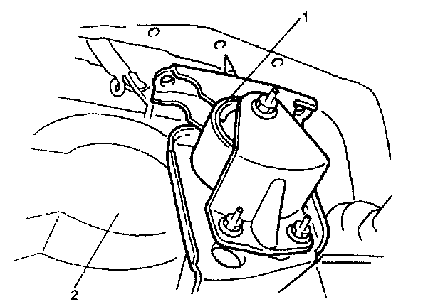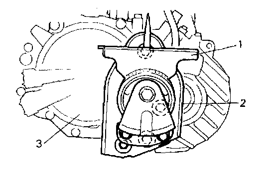 16. Remove engine left mounting (1) and its bracket (2) from transmission (3) case.
