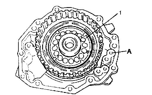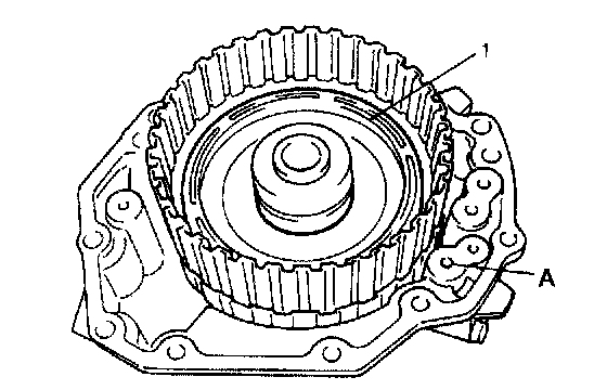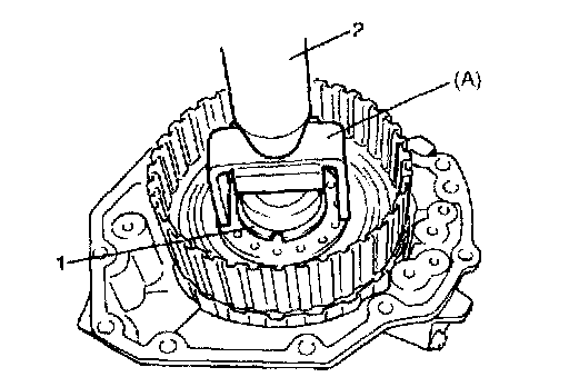 8. Remove overdrive clutch piston (1) with O-rings using compressed air (400 - 800 kPa, 4 - 8 kgf/cm2, 57 - 113 psi) through oil hole (A).