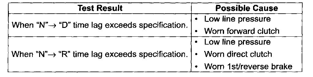 TestThis test is to check conditions of clutch, reverse brake and fluid pressure. "Time lag" means time elapsed since select lever is shifted with engine idling till shock is felt.