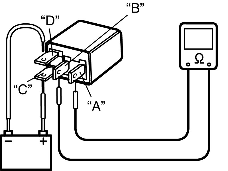 Check that there is continuity between terminals "A" and "B" when battery is connected to terminals "C" and "D".