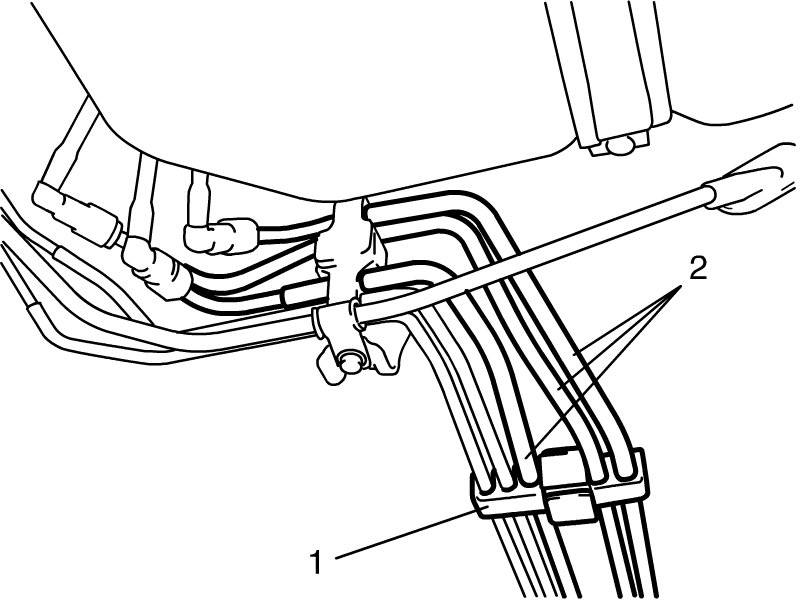 7) Mark the location of clamps (1) on fuel pipes (2), so that the clamps can be reinstalled to where they were.