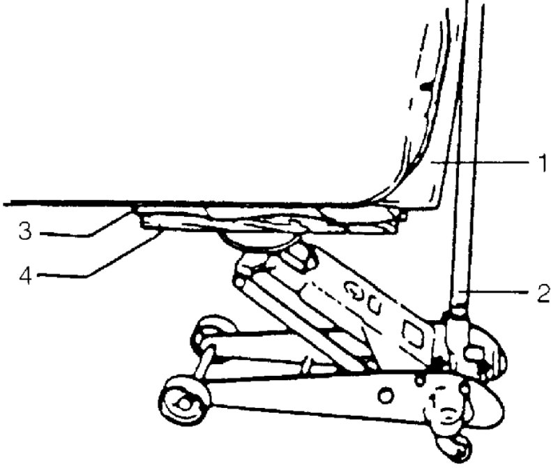 5. Support door panel (1) using a jack (2) with rags (3) and a piece of wood (4) placed between jack (2) and panel (1) as shown.