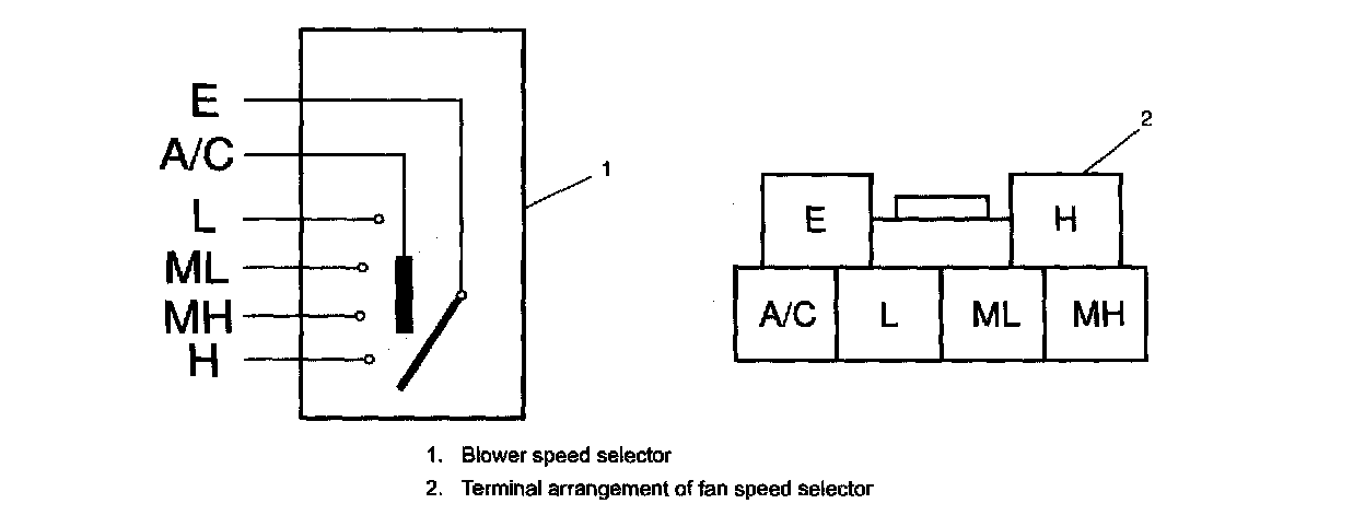 - Check blower speed selector for each terminal to terminal continuity. If check result is not as specified, replace.