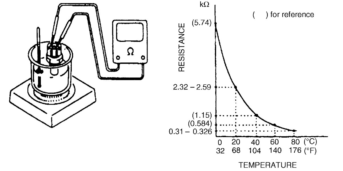 Immerse temperature sensing part of ECT sensor in water and measure resistance between sensor terminals while heating water gradually.