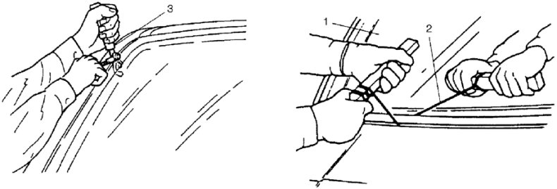 9. Cut adhesive all around windshield (1) with piano string (2). When using tool, windshield knife (3), to cut adhesive, be careful not to cause damage to windshield. Use wire to cut adhesive along lower part of windshield.