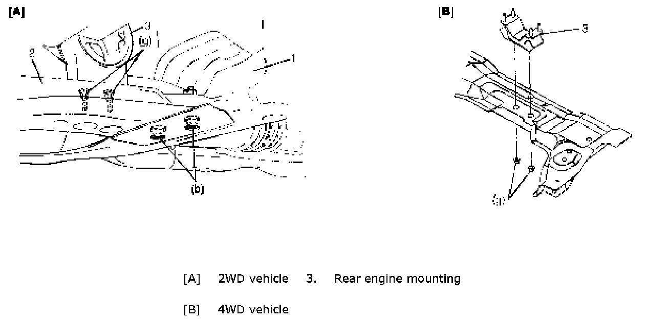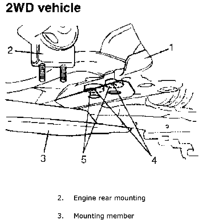 4) Remove engine rear mounting nuts and engine mounting member bolts (2WD vehicle).
