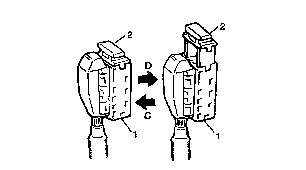 2. Disconnect ABS hydraulic unit/control module assembly connector (1) by pulling up lock (2).