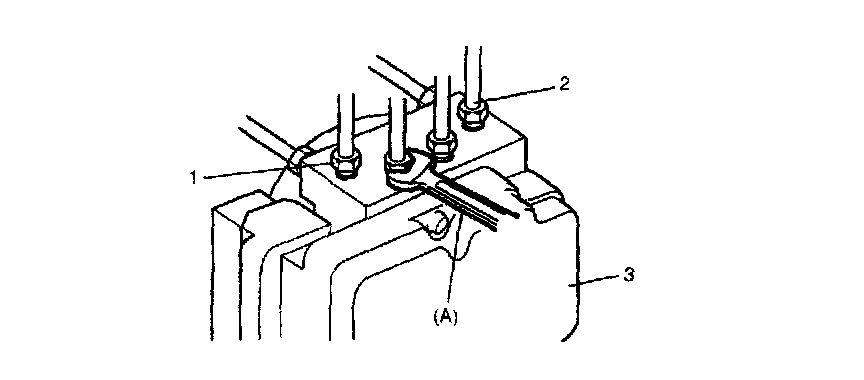 3. Using special tool, loosen flare nuts (1) and disconnect brake pipes (2) from ABS hydraulic unit/control module assembly (3).