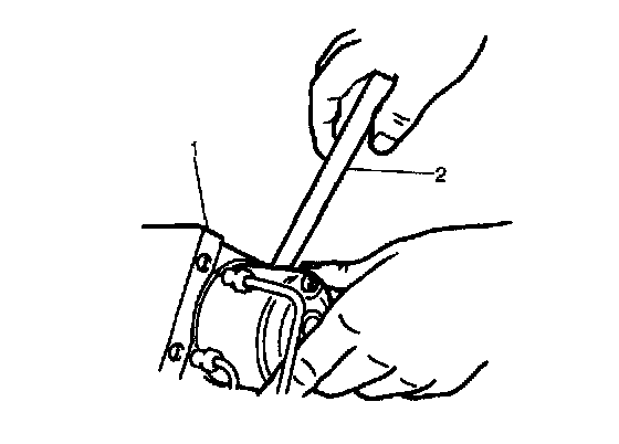 4. Remove two bolts and disconnect take out ABS hydraulic unit/control module assembly (1) from bracket using flat end rod or the like (2)