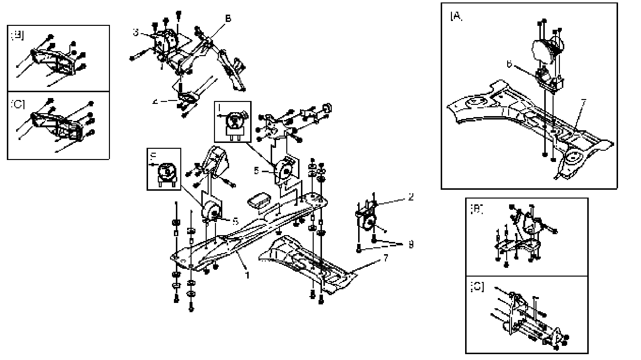 7) Install mounting member (1) to front member and suspension frame (7) for 2WD vehicle.
