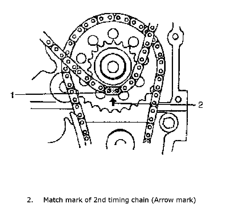4) Install 2nd timing chain by aligning yellow plate (1) of 2nd timing chain and match marks on idler sprocket.