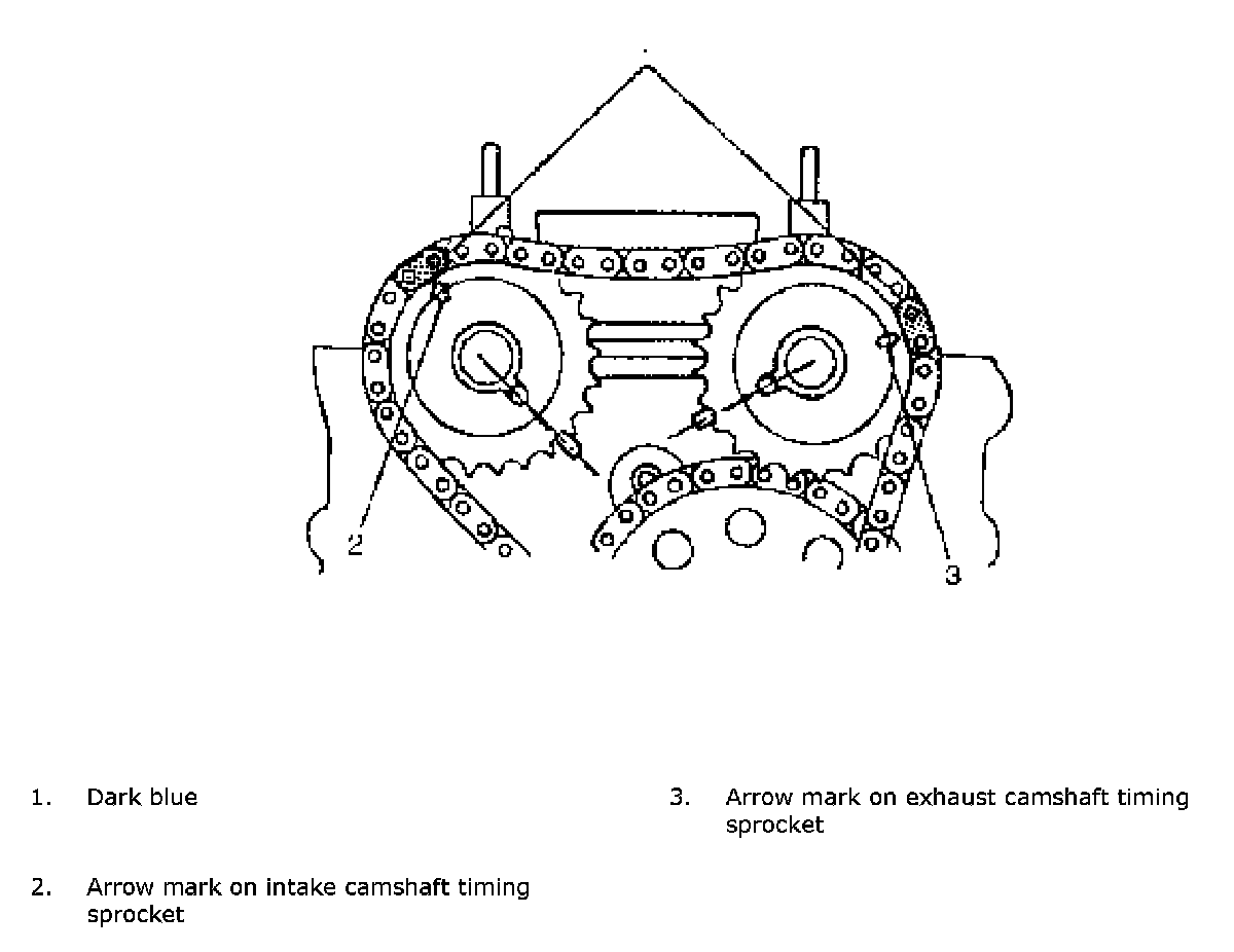 5) Install sprockets to intake and exhaust camshafts by aligning dark blue plate of 2nd timing chain, match marks on intake sprocket and exhaust sprocket respectively.