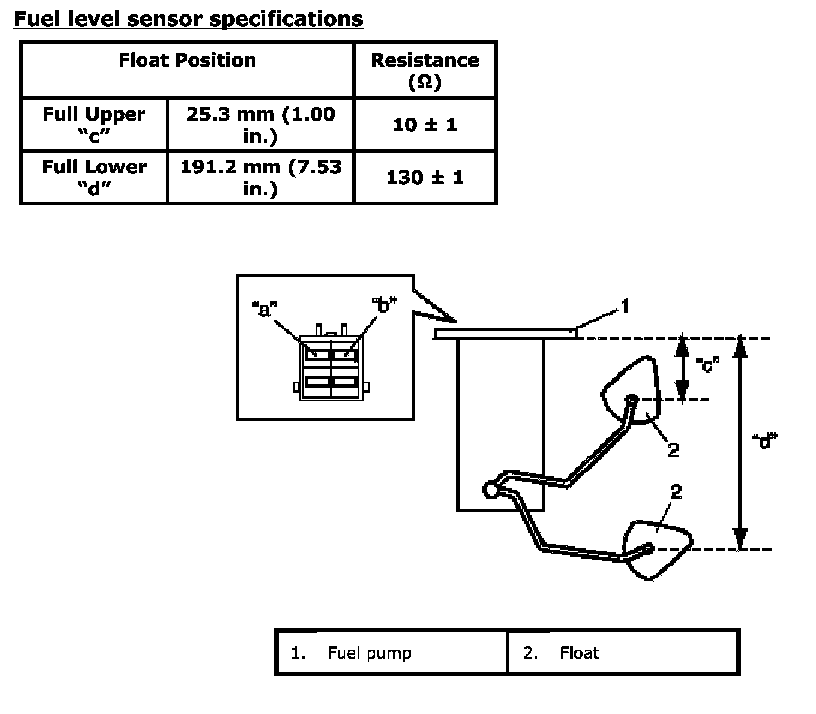 - Check that resistance between terminals "a" and "b" of fuel level sensor changes with change of float position.