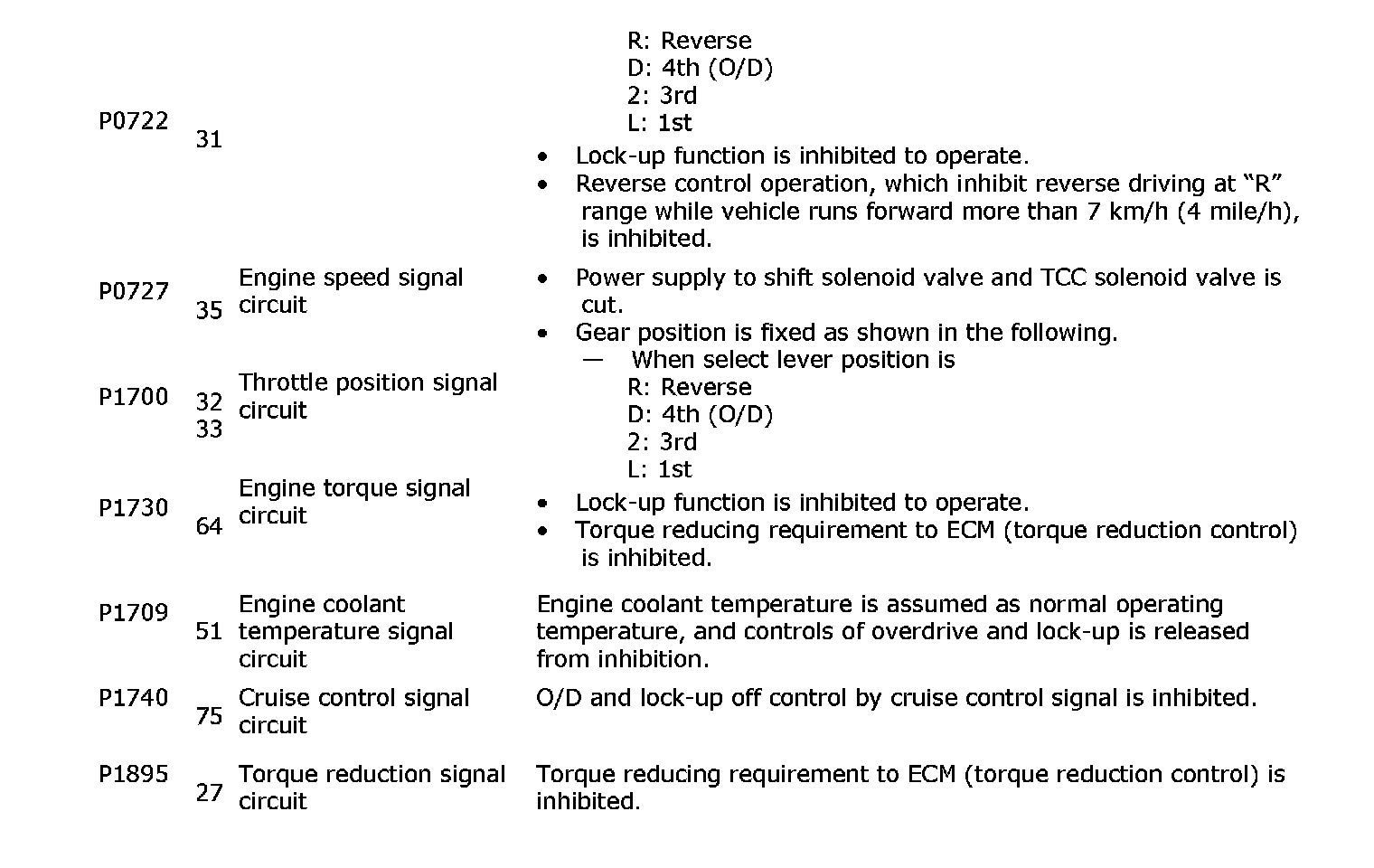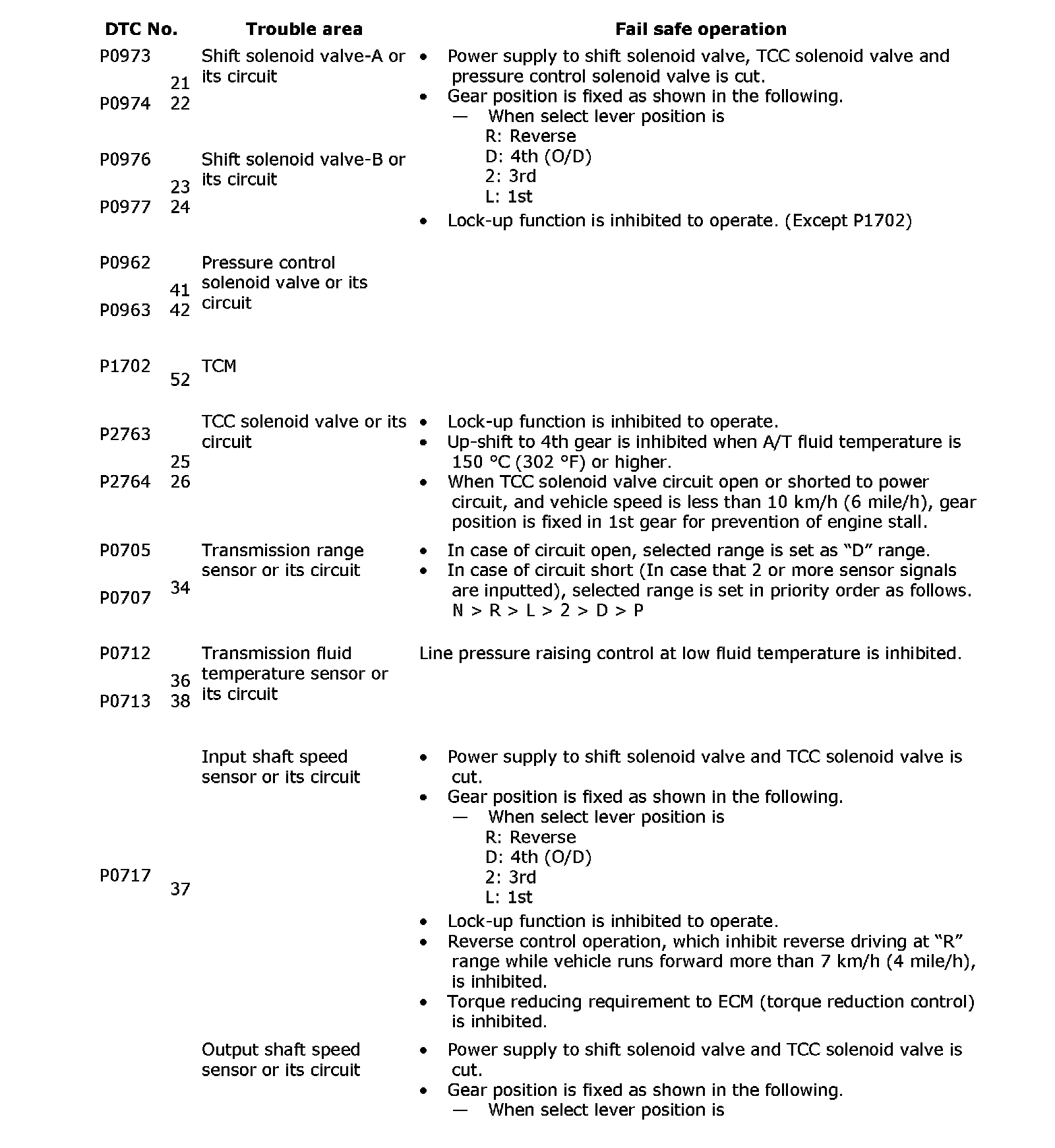 This function is provided by the safe mechanism that assures safe driveability even when the solenoid valve, sensor or its circuit fails. The following table shows the fail safe function for each fail condition of sensor, solenoid, TCM or its circuit.