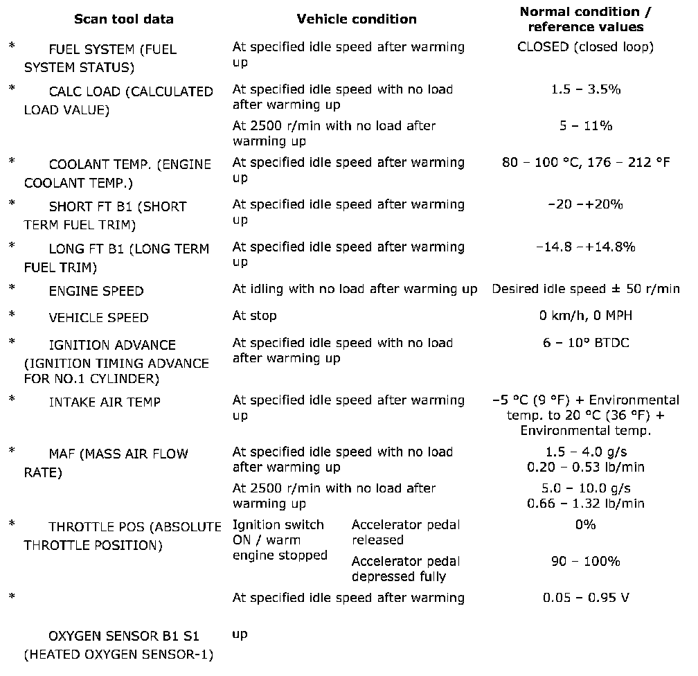 As the data values are standard values estimated on the basis of values obtained from the normally operating vehicles by using a scan tool, use them as reference values. Even when the vehicle is in good condition, there may be cases where the checked value does not fall within each specified data range. Therefore, judgment as abnormal should not be made by checking with these data alone.