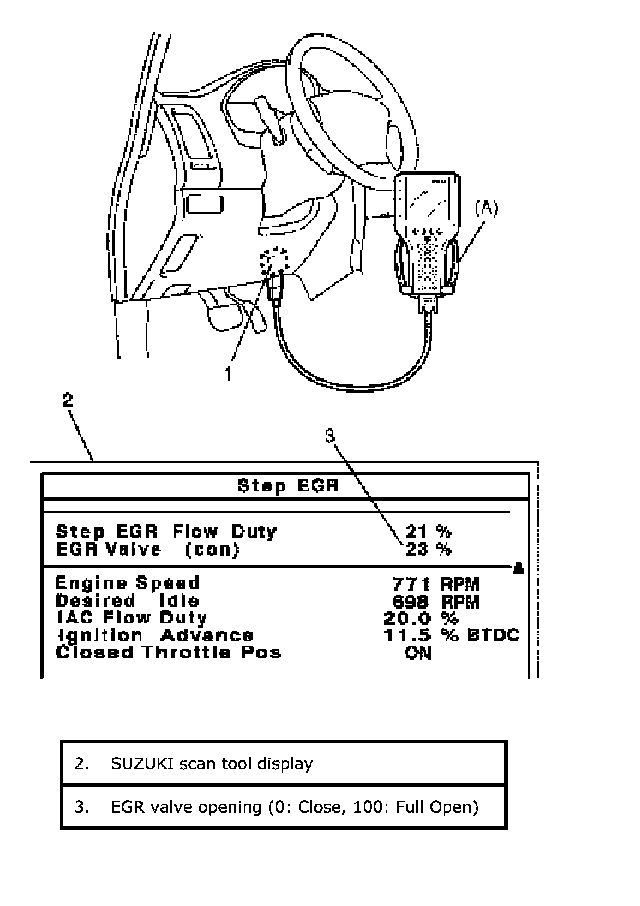 EGR System Inspection (Using SUZUKI Scan Tool)1. Connect SUZUKI scan tool to data link connector (DLC) (1) with ignition switch turn OFF.