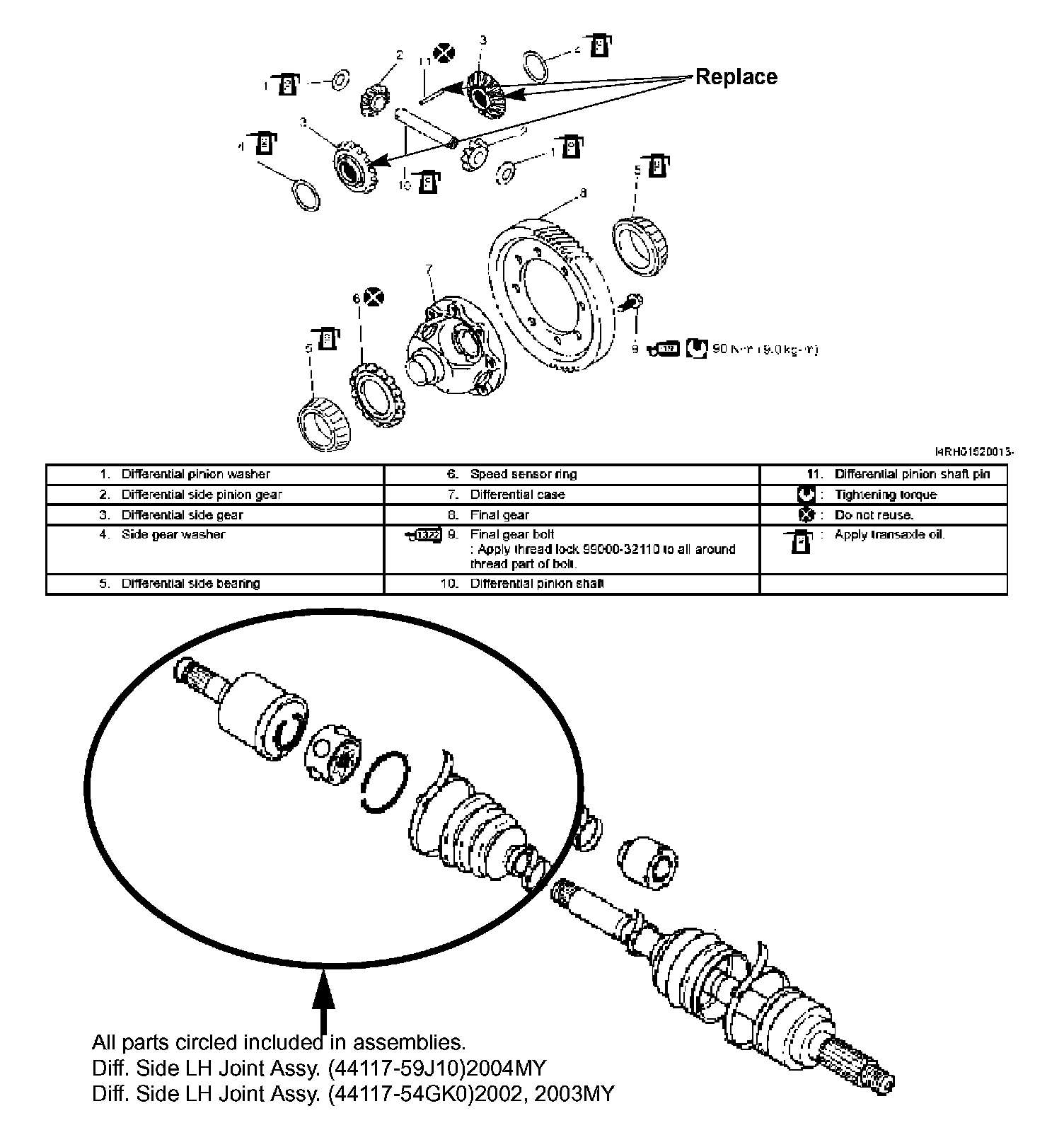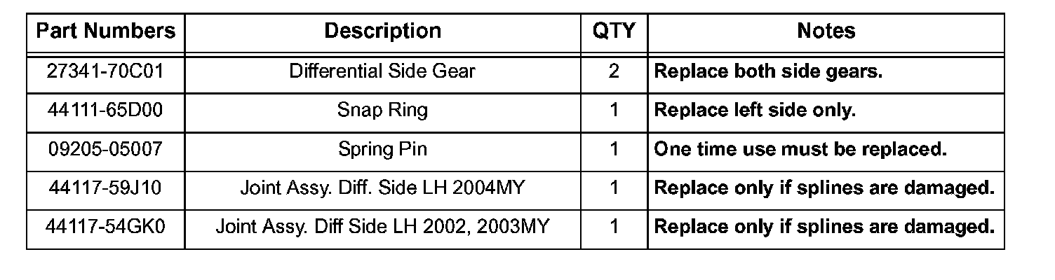 If the vehicle has the above listed condition replace the differential side gears with updated part. Replace "Snap Ring" on left inner CV joint with updated part. Follow "Differential Disassembly and Assembly" procedure in appropriate Aerio Service Manual. See below for part number and identification.