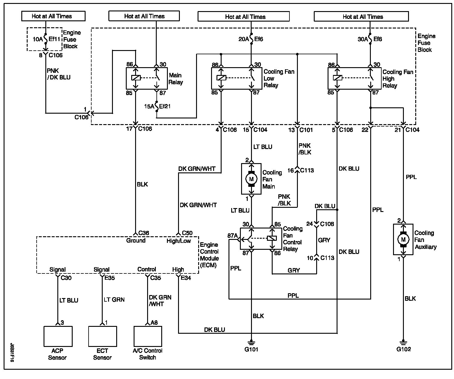 The engine cooling fan circuit operates the main cooling fan and the auxiliary cooling fan. The cooling fans are controlled by the Engine Control Module (ECM) based on inputs from the Engine Coolant Temperature (ECT) sensor and the Air Conditioning Pressure (ACP) sensor. The ECM controls the low speed cooling fan operation by internally grounding the ECM connector terminal C50. This energizes the low speed cooling fan relay and operates the main cooling fan and the auxiliary cooling fan at low speed as the cooling fans are connected in a series circuit. The ECM controls the high speed cooling fan operation by internally grounding the ECM connector terminal C50 and the ECM connector terminal E34 at the same time. This energizes the low speed cooling fan relay, the high speed cooling fan relay, and the series/parallel cooling fan relay resulting in high speed fan operation as the cooling fans are now connected in a parallel circuit.