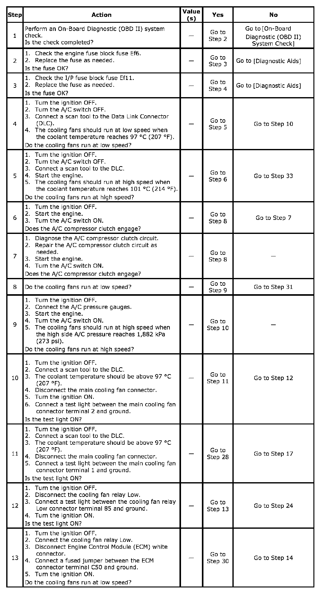 2. This step, along with Step 9, checks for the ability of the ECM to operate the cooling fans in response to A/C pressure readings.