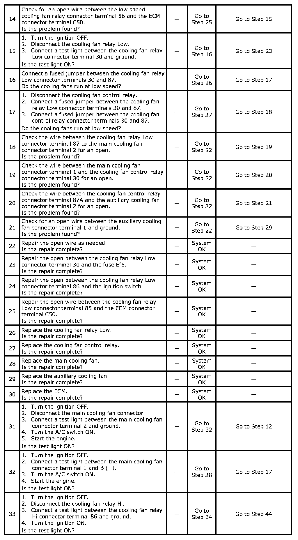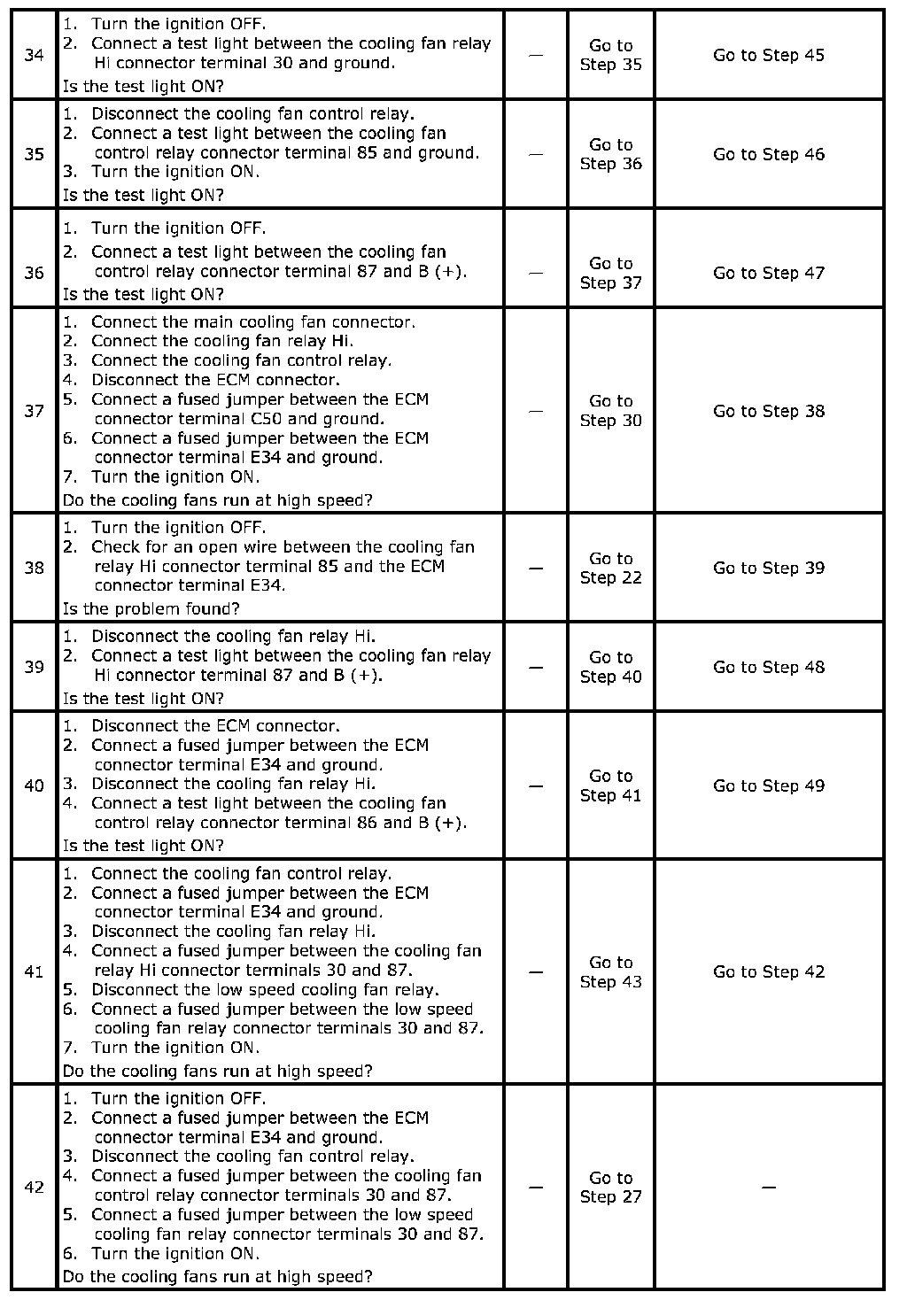 ^ The cooling fan circuit can be checked quickly by disconnecting the ECM connector 2 and grounding the connector terminal C50. This should create low speed cooling fan operation with the ignition ON. By grounding the ECM connector terminals C50 and E34 and turning the ignition ON, high speed cooling fan operation should be achieved.
