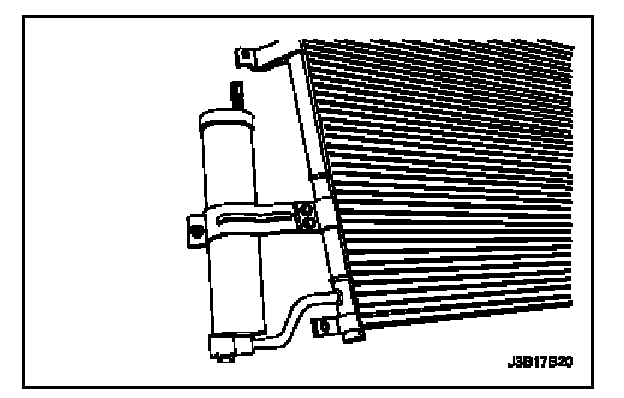 3. Install the receiver-dryer into the band clamp. Support the receiver-dryer-to-condenser pipe while pushing the receiver-dryer downward until the pipe is fully installed.