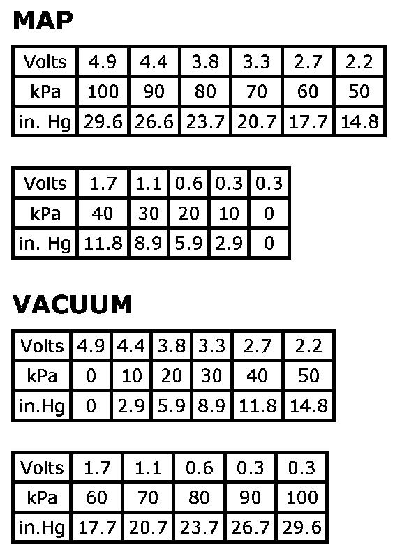 A failure in the MAP sensor circuit sets a diagnostic trouble code P0107 or P0108. The following tables show the difference between absolute pressure and vacuum related to MAP sensor output, which appears as the top row of both tables.