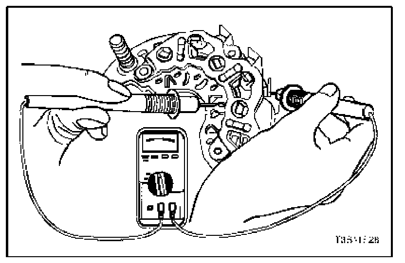 8. Test the rectifier bridge by connecting the ohmmeter terminals to the bridge and the heat sink.