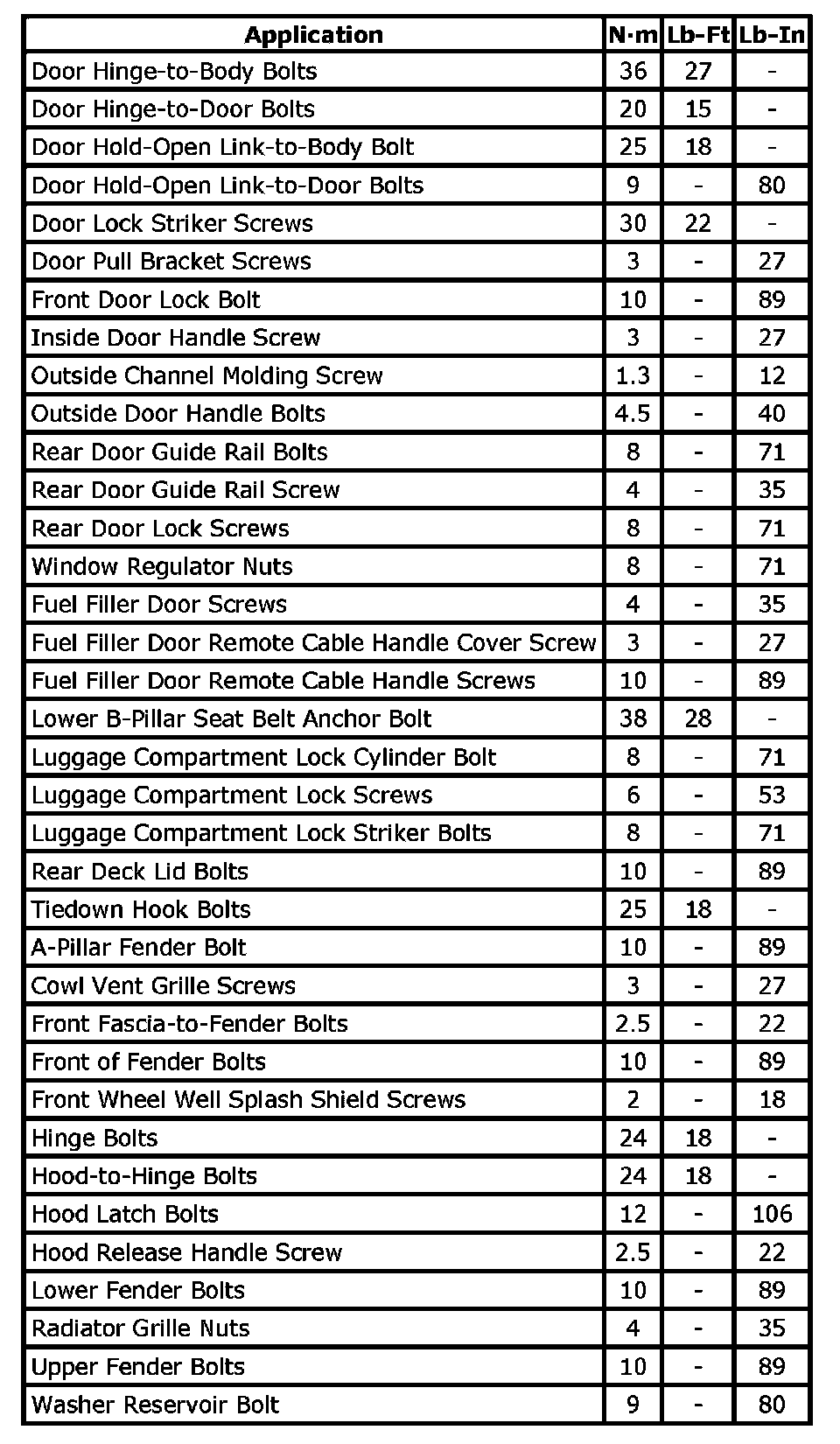 Tightening Torque Specifications: