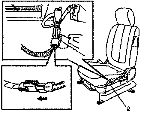 6. If equipped with side air bag (inflator) module, connect yellow connector (2) of side air bag (inflator) module by pushing connector till click is heard from it.