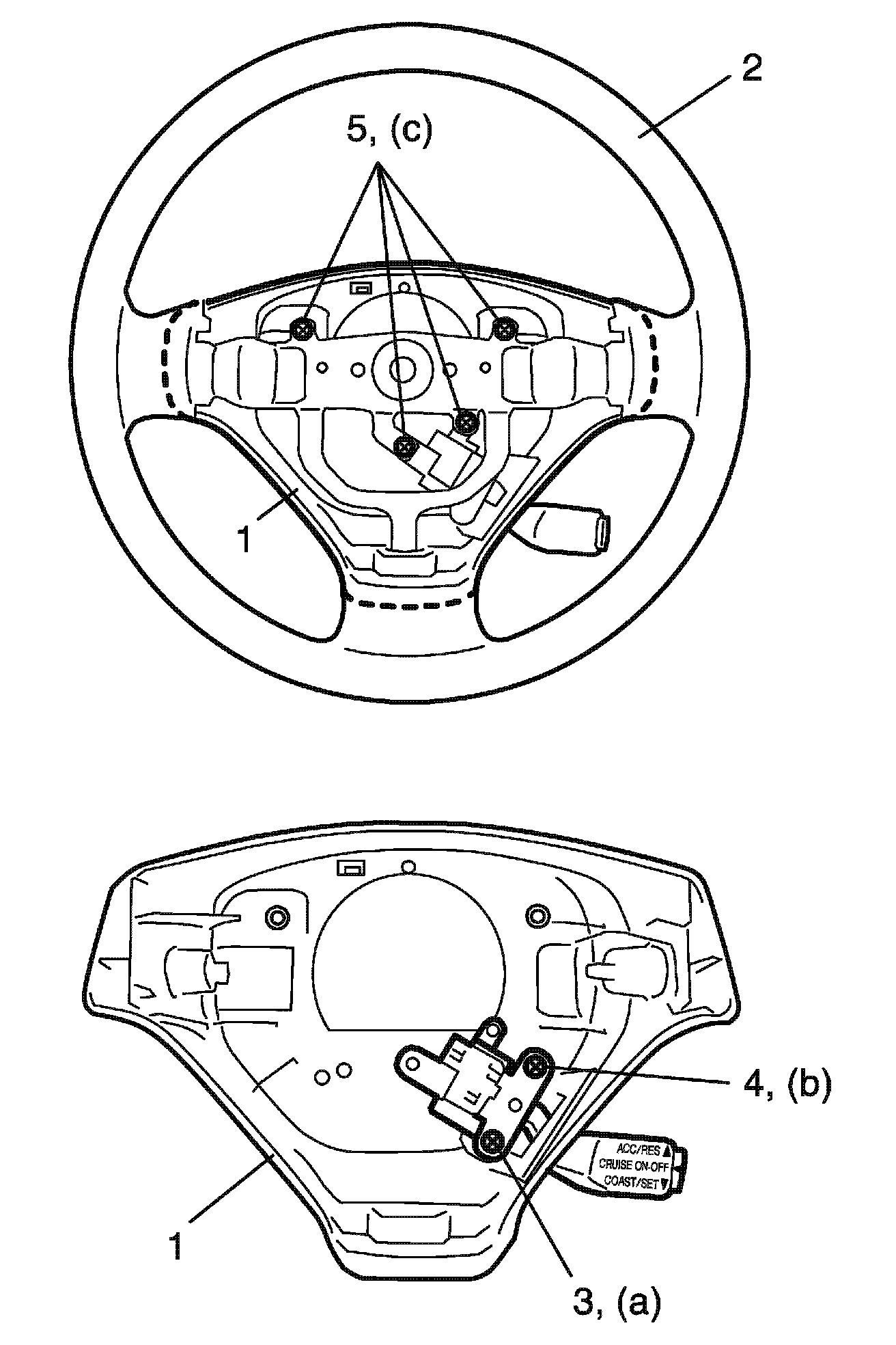 - Tighten cruise control lever bolt (3), cruise control lever screw (4) and steering wheel lower cover screws (5) as specified torque.