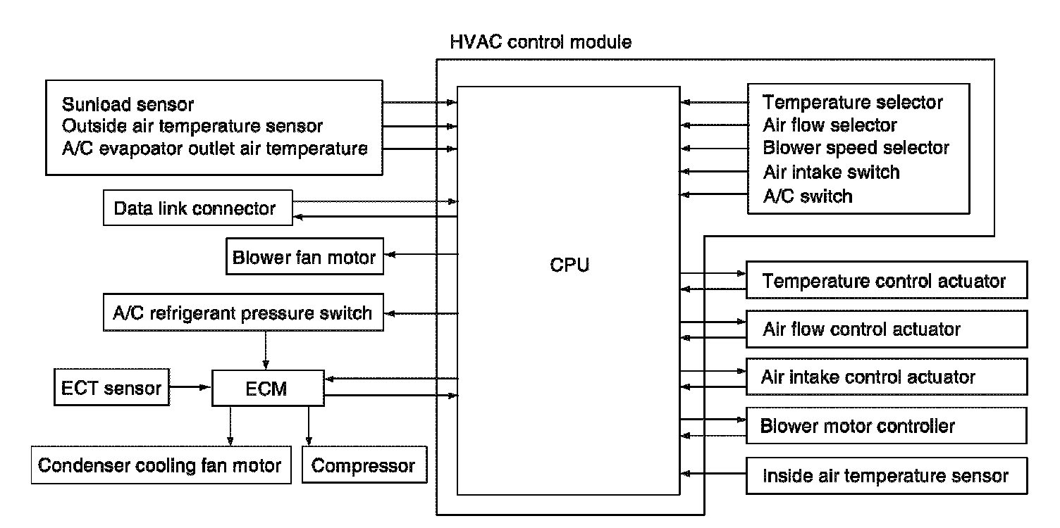Automatic air conditioning system is that controller in HVAC control module (1) automatically controls in-car temperature, fan speed, airflow outlet and so forth. Once users set up desired in-car temperature by temperature selector of HVAC control module, the controller in HVAC control module detects in-car temperature, outside air temperature, amount of sunlight, and engine coolant temperature by inside air temperature sensor (2), outside air temperature sensor (3), sunload sensor (4), and ECT sensor (5). Then, controller of HVAC control module keeps desired in-car temperature at any time.