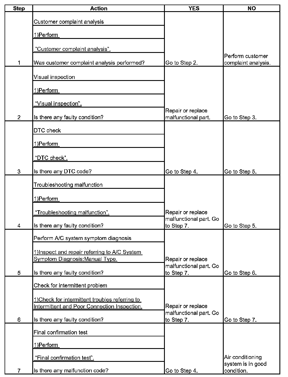 As a preliminary step, be sure to perform visual check of the items that support proper function of the air conditioning referring to Visual Inspection: Manual Type.