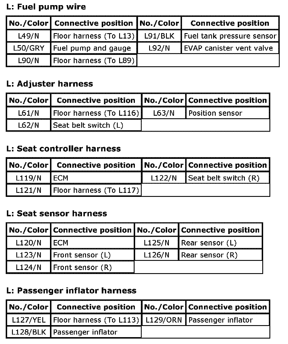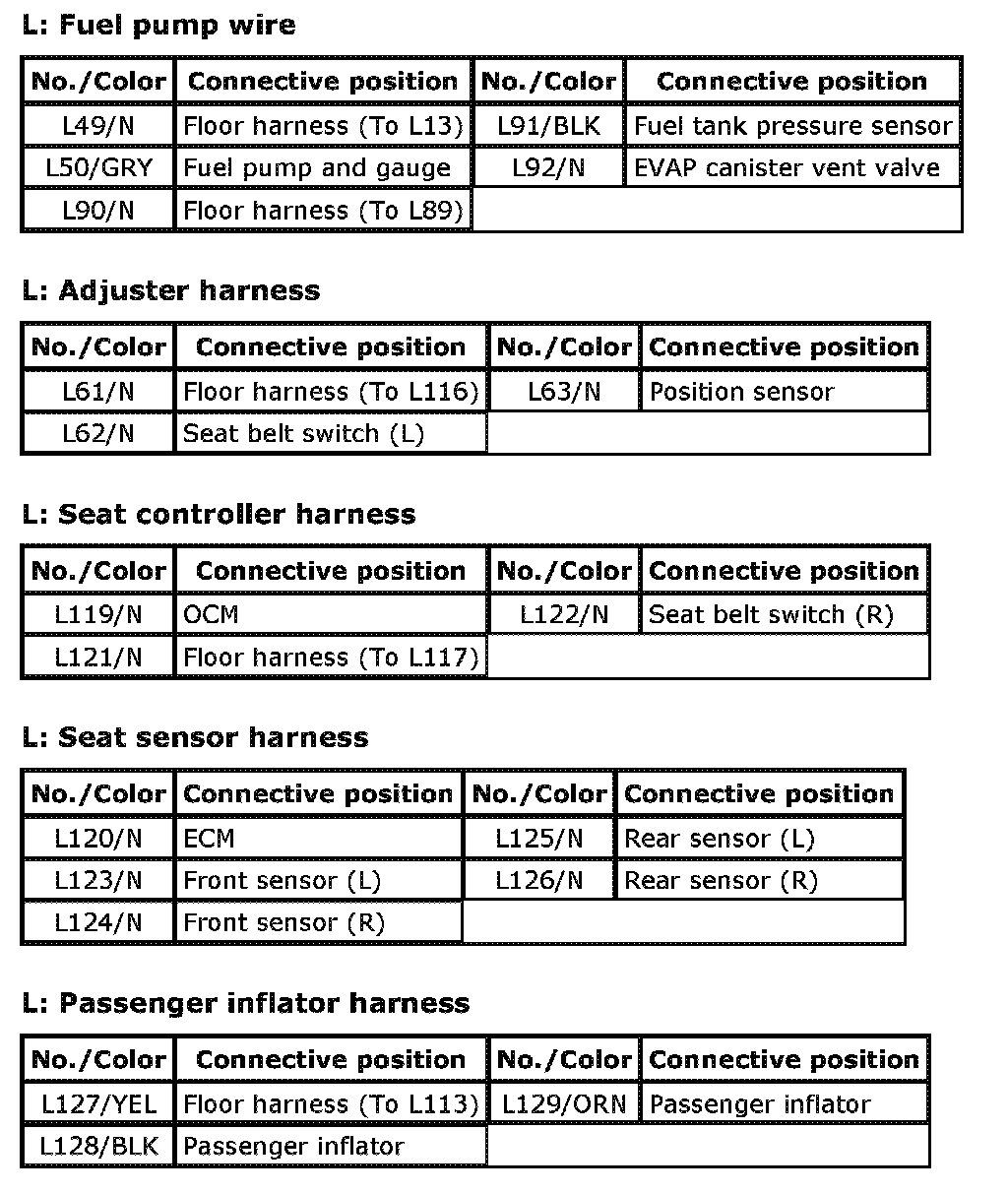 L: Floor Harness, Fuel Pump Wire, Adjuster Sensor Harness, Seat Controller Harness, Seat Sensor Harness, Passenger Harness (Sedan) Index: