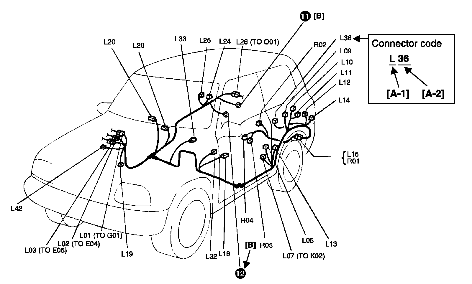 HOW TO READ CONNECTOR LAYOUT DIAGRAM[A-1]: Harness symbol and corresponding harness name