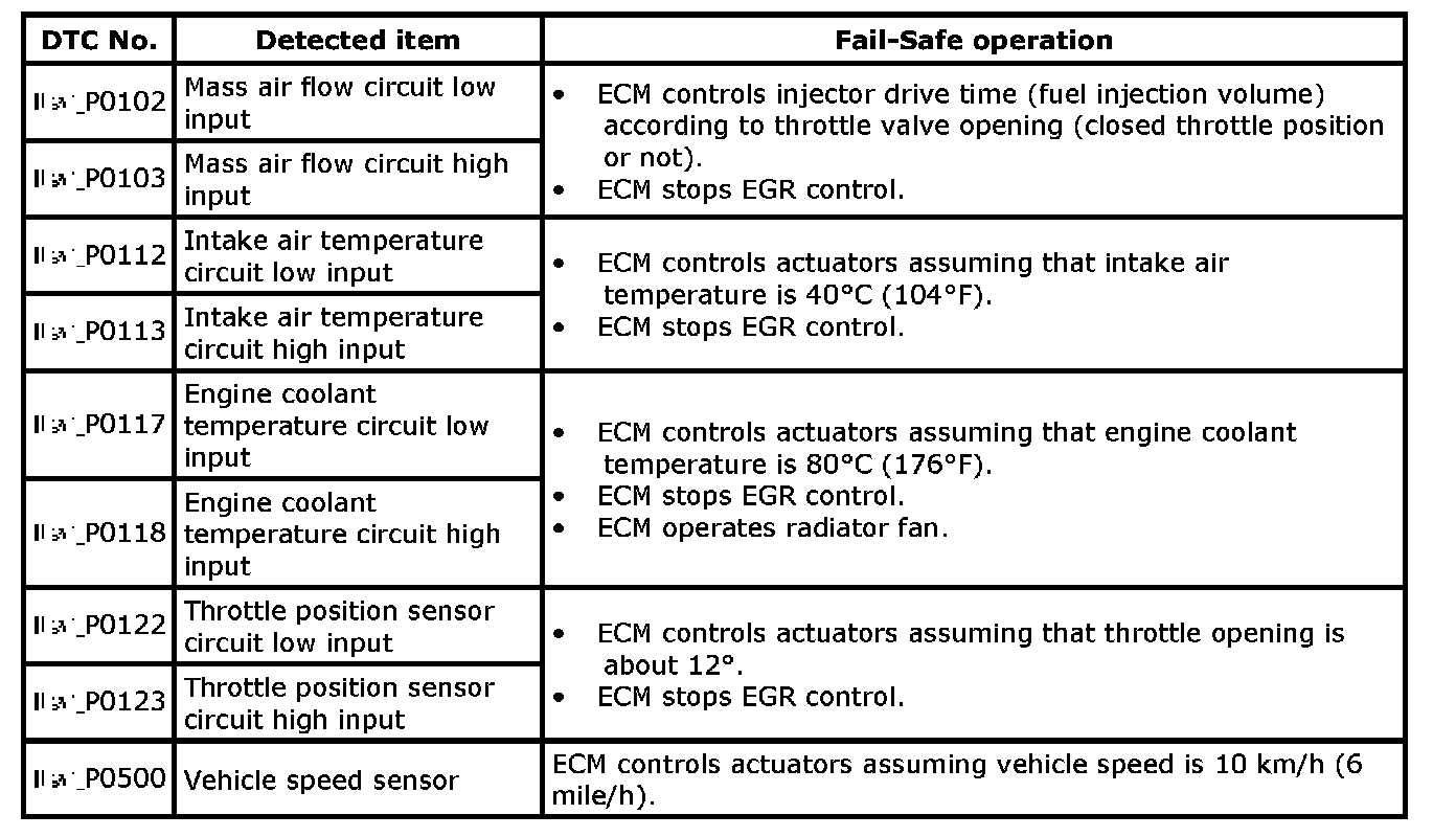 When any of the following DTCs is detected, ECM enters fail-safe mode as long as malfunction continues to exist but that mode is canceled when ECM detects normal condition after that.