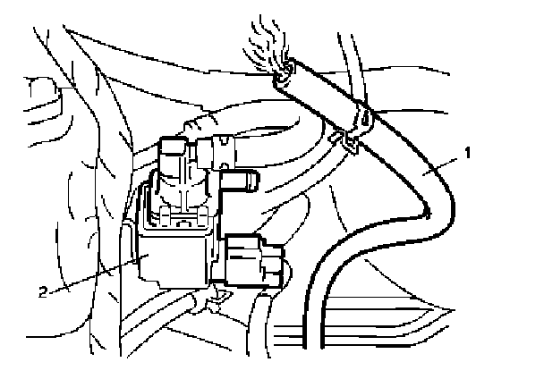 9. Disconnect EVAP canister purge hose (1) from EVAP canister purge valve (2) and check that smoke comes out of it in order to verify smoke is filled the EVAP system.