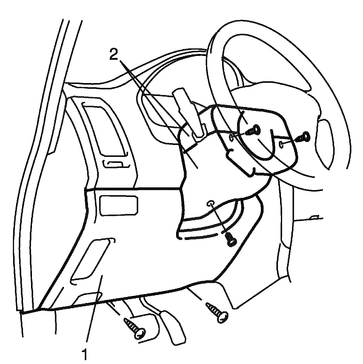 4. Remove steering column covers (2), and then turn steering wheel to remove steering column cover screws (3).
