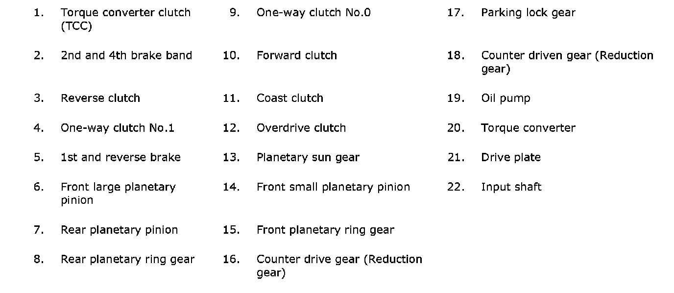 A/T DescriptionThis automatic transaxle is a full automatic type with 3-speed plus Overdrive (O/D). The torque converter is a 3-element, 1-step and 2-phase type and is equipped with an electronically controlled lock-up mechanism. The gear shift device consists of 2 sets of planetary gear units, 4 disc type clutches, a disc type brake, a band type brake and 2 one-way clutches. The gear shift is done by selecting one of 6 positions ("P", "R", "N", "D", "2" and "L") by means of the select lever installed on the floor. On the shift knob, there is an Overdrive (O/D) off switch which prevents shift-up to the overdrive mode.