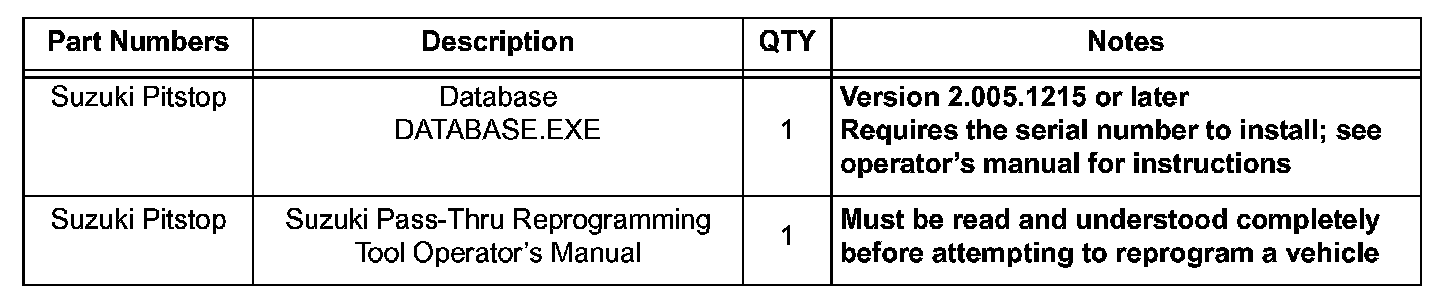 4. Download the Suzuki Pass-Thru Reprogramming Data Base "DATABASE.EXE" onto your PC. Follow the procedure in Section 3.2 of the Operator's Manual to update the Database files. This step is only required to be done once to accommodate all vehicles covered under this TSB.