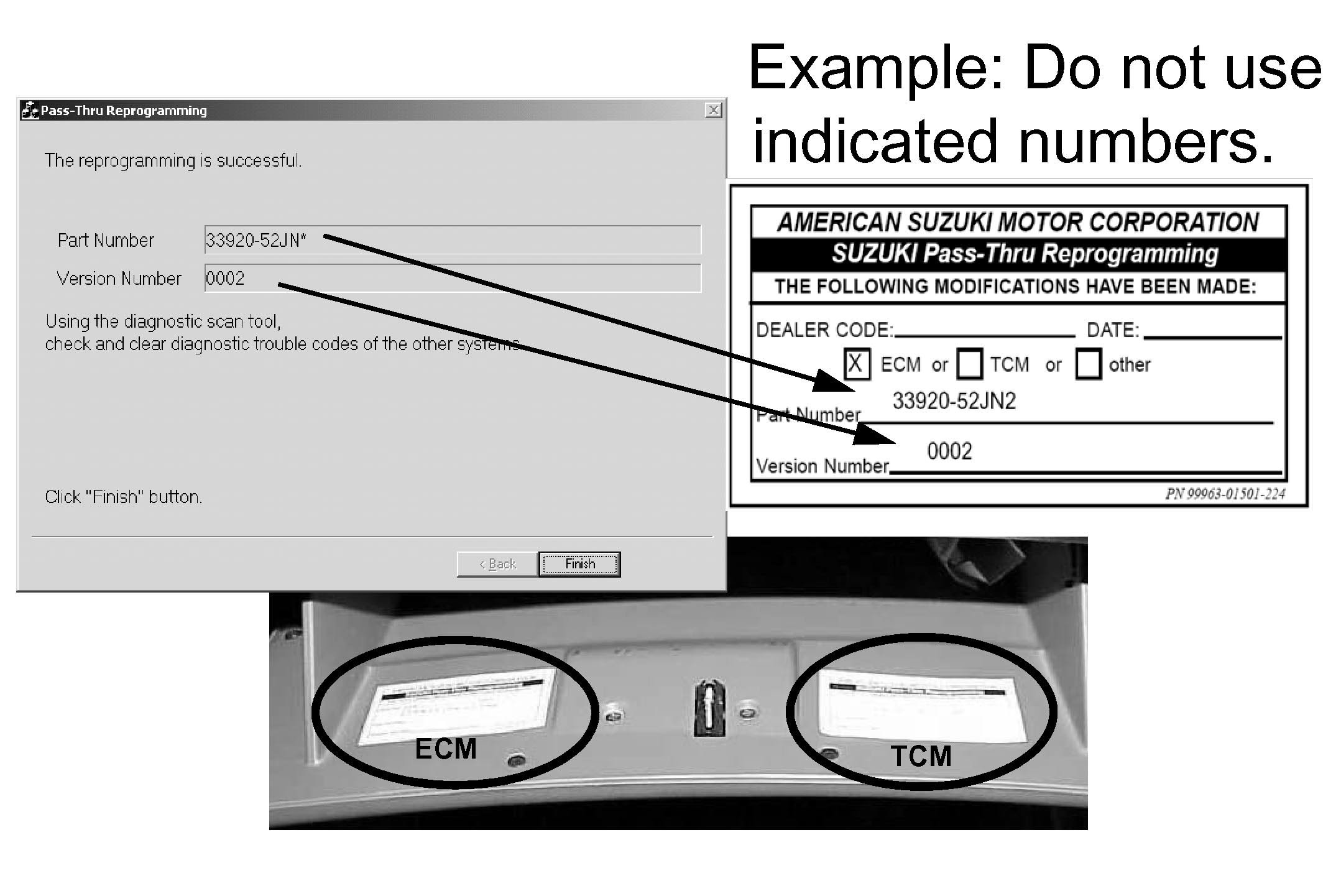 6. Fill out the Reprogram Label P/N 99963-01501-224 (the part number and version will be displayed at the "The reprogramming is successful" screen). Then affix the label to the back of the glove box door as pictured below.