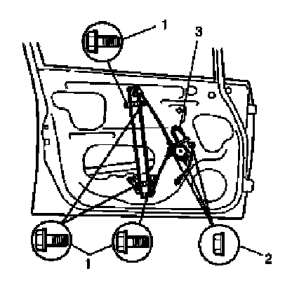 3. Loosen regulator mounting bolts (1) and nuts (2), and then remove front door window regulator (3).