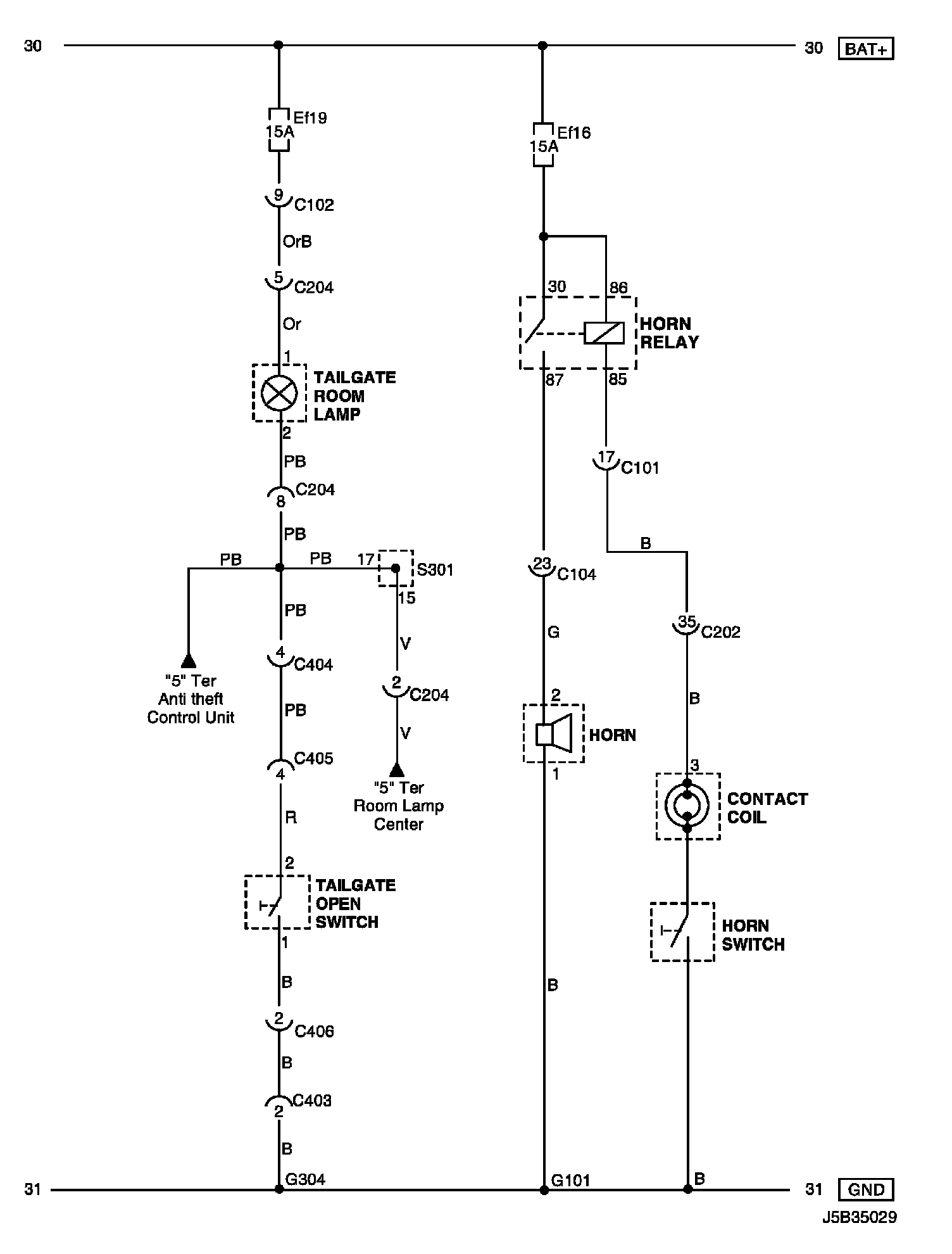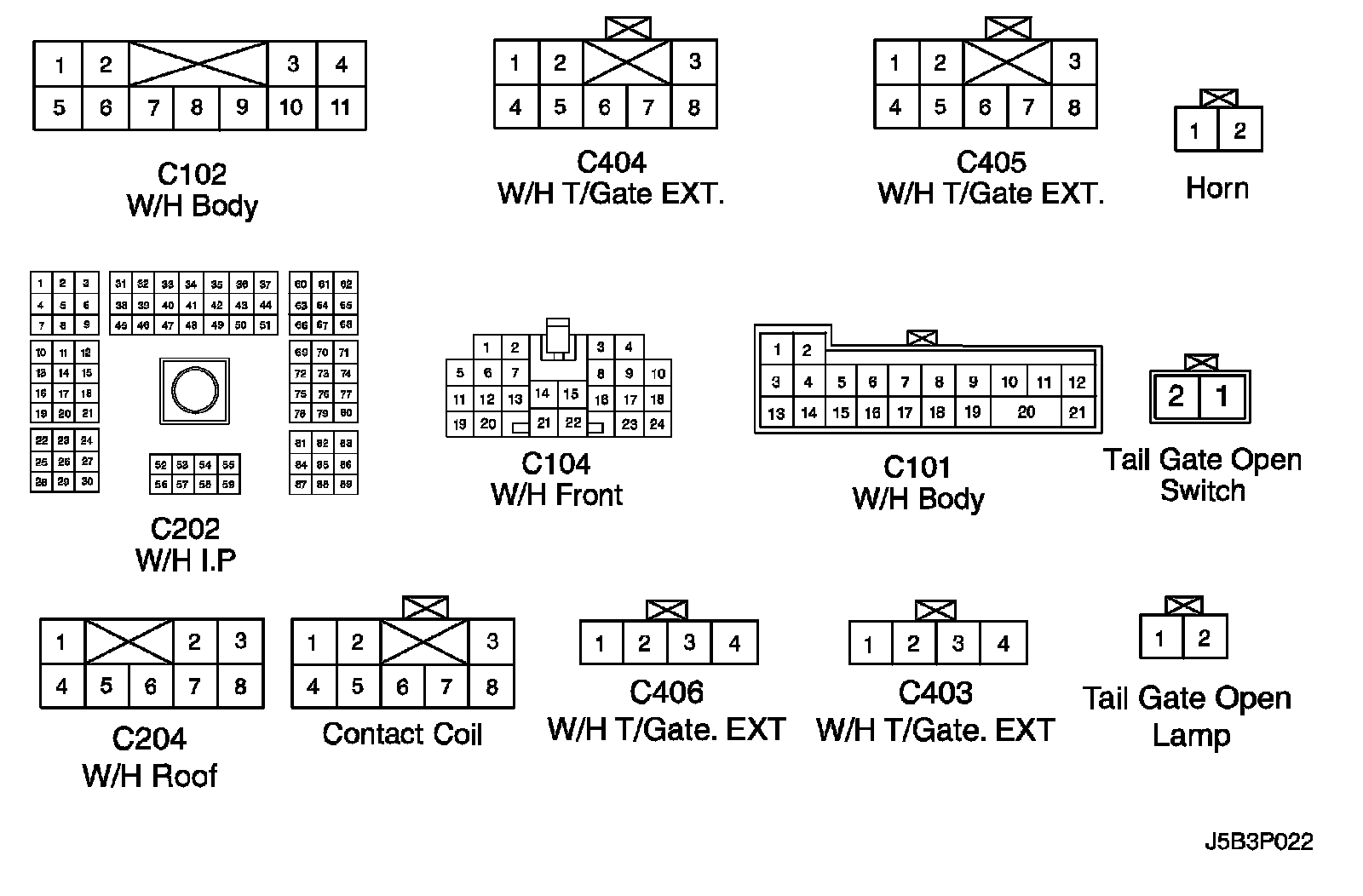 Trunk/Tailgate Open Switch, Trunk Latch Switch, Trunk Room Lamp and Horn Circuit Wiring Diagram:
