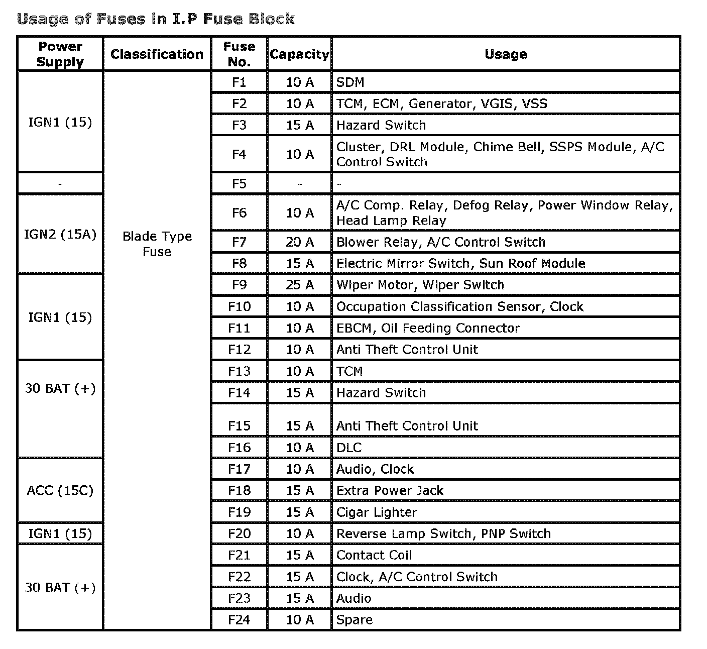 Usage of Fuses in I.P Fuse Block: