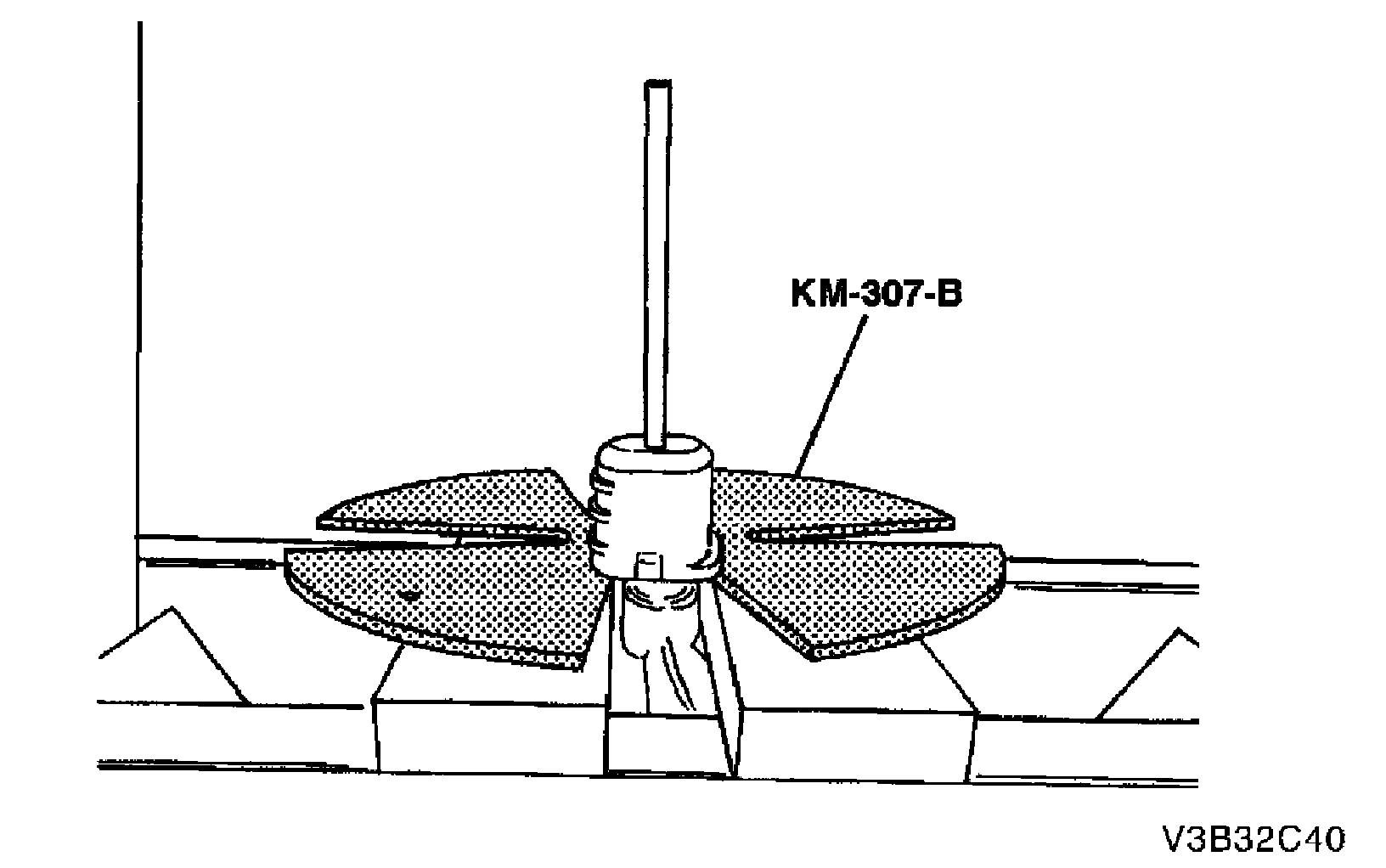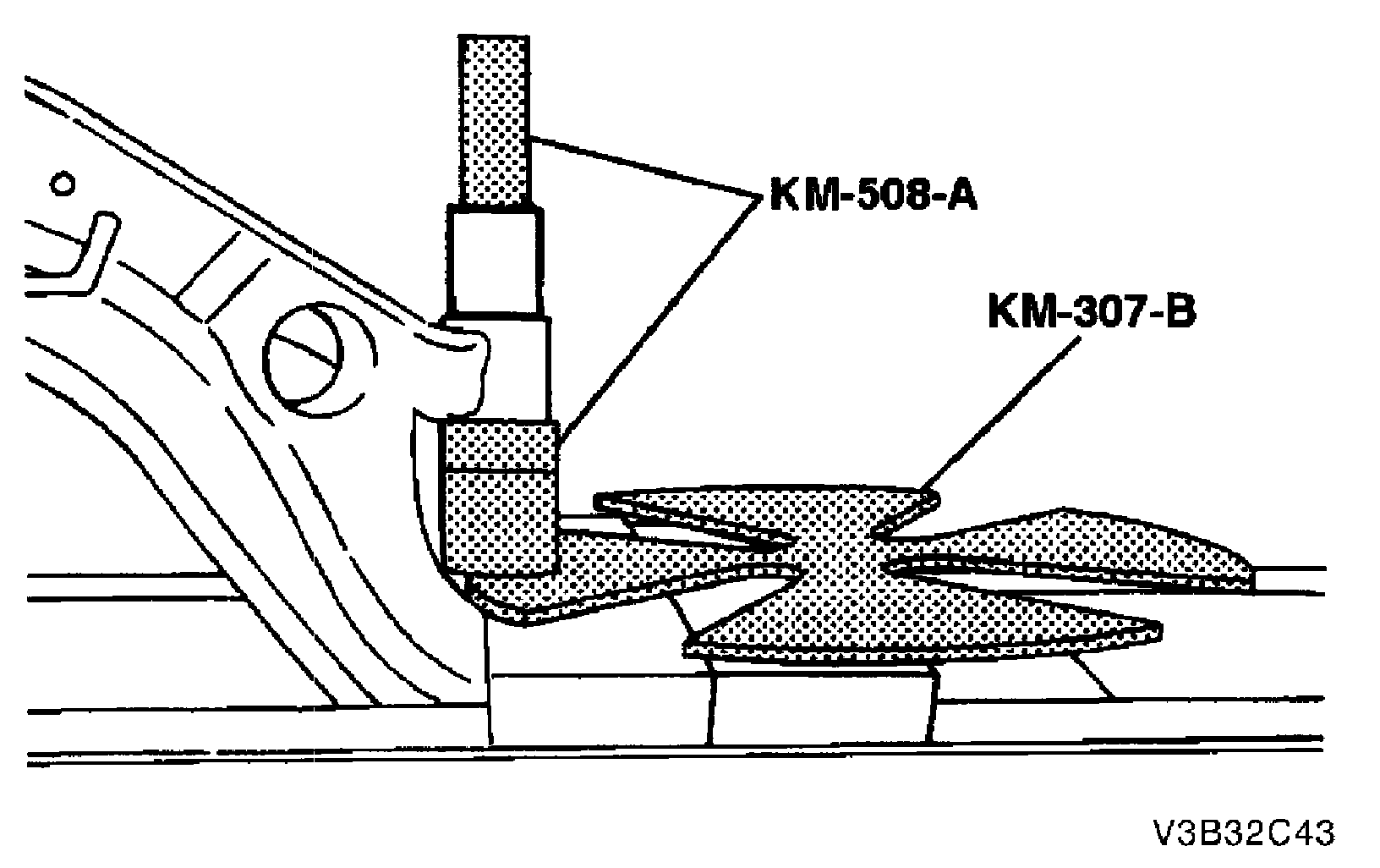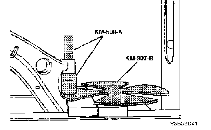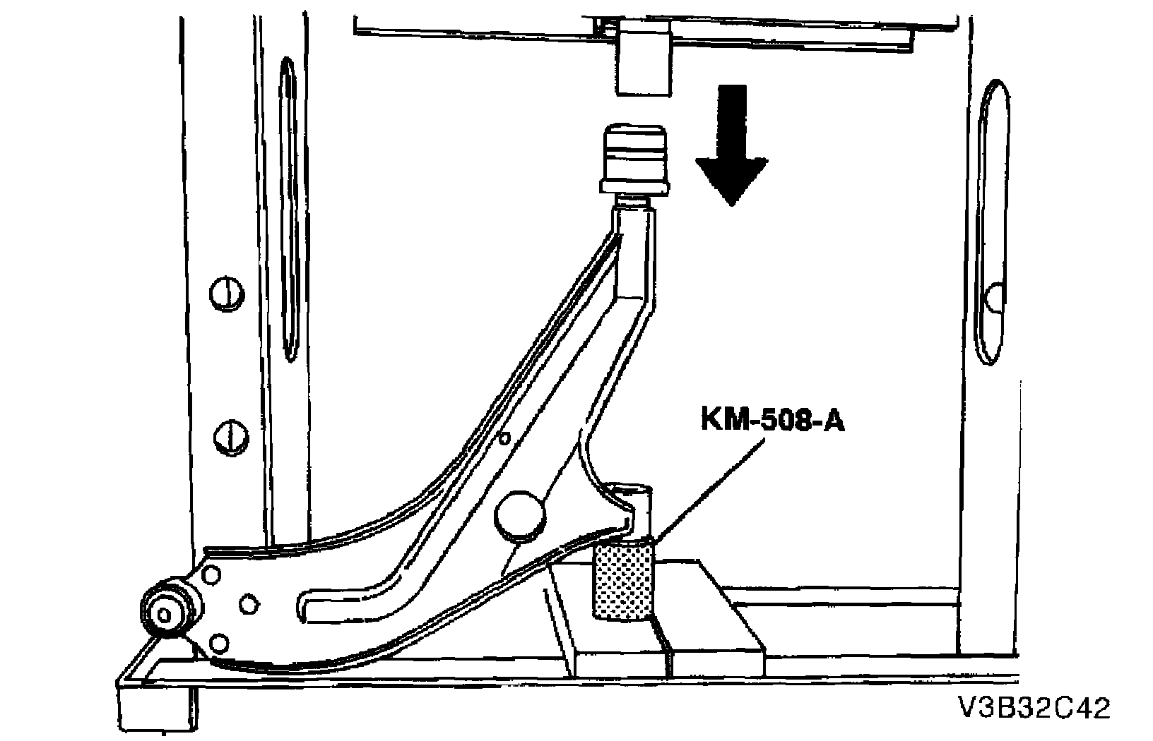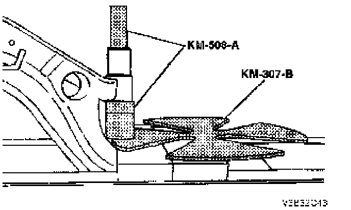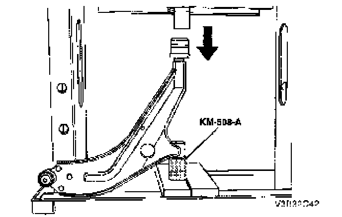 2. Remove the control arm rear bushing using a press, the removal plate KM-307-13, and a drift.