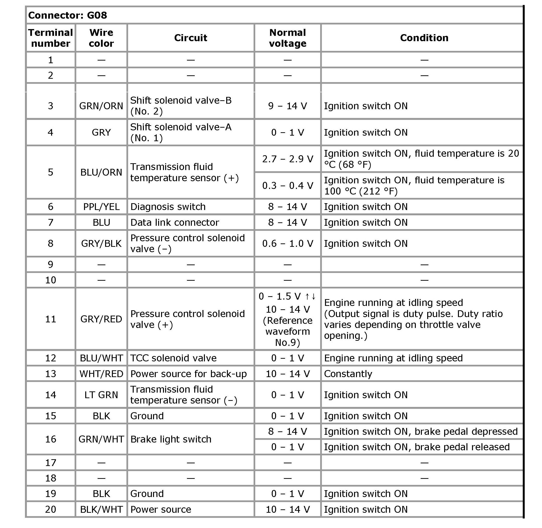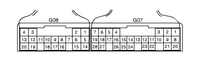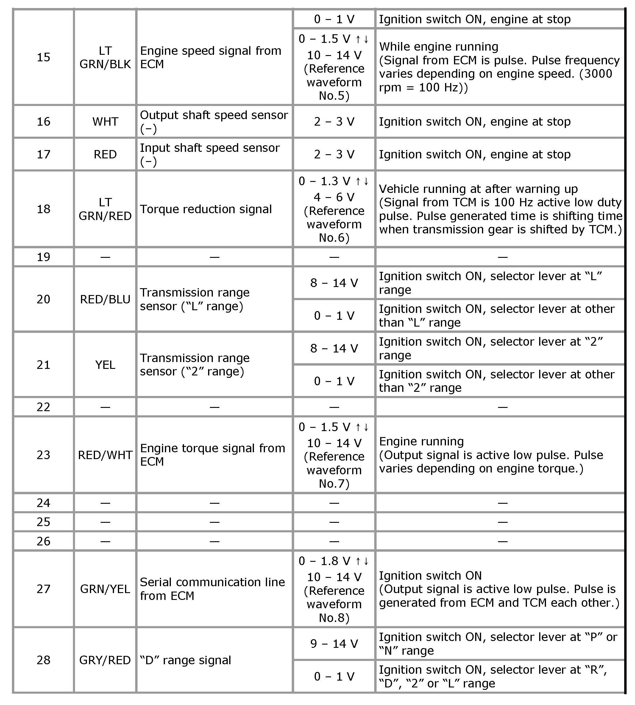 Terminal arrangement of TCM coupler (Viewed from harness side)