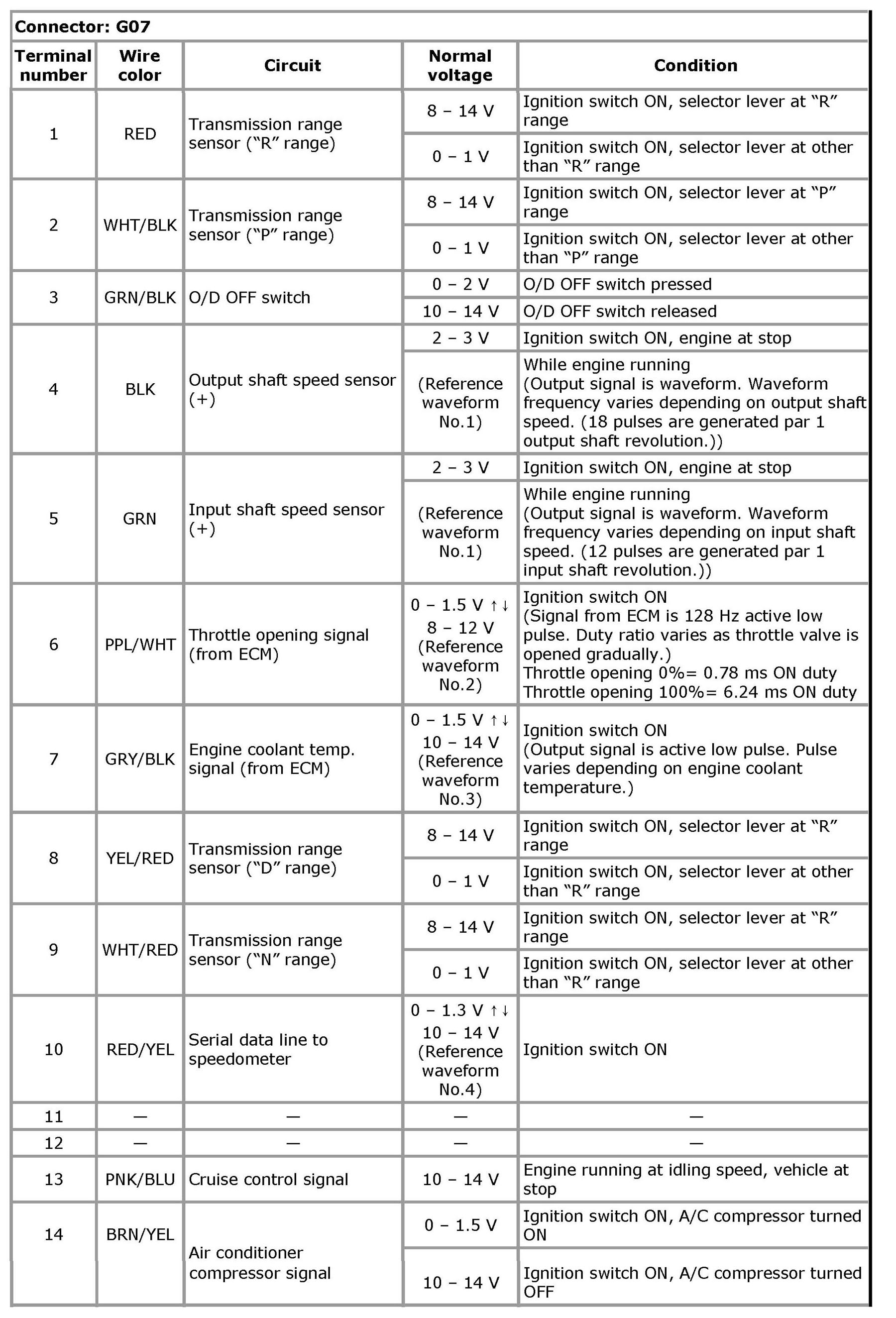 Inspection of TCM and Its CircuitsTCM and its circuits can be checked at TCM wiring connectors by measuring voltage and resistance.