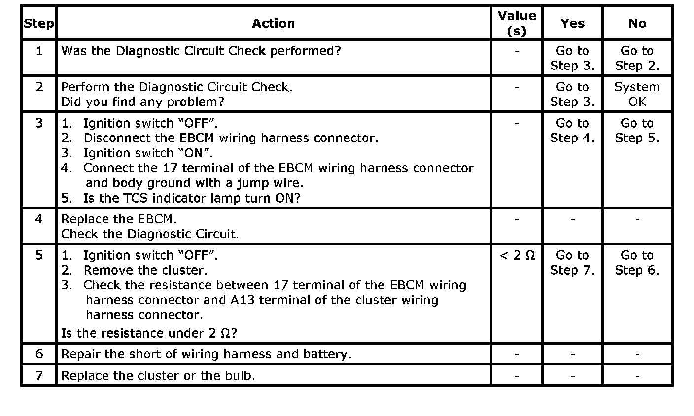 Typical causes of the TCS warning Lamp inoperative with no DTC(s) set are as following.