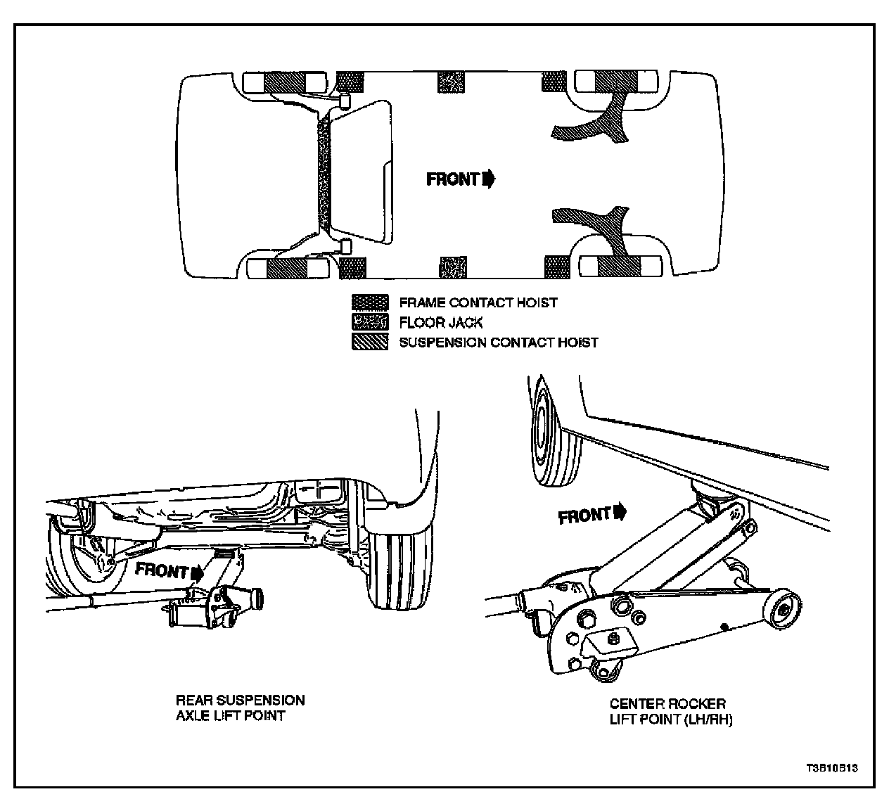 Vehicle Lifting ProceduresCAUTION: To raise the vehicle, place the lifting equipment only at the points indicated. Failure to use these precise positions may result in permanent body deformation.